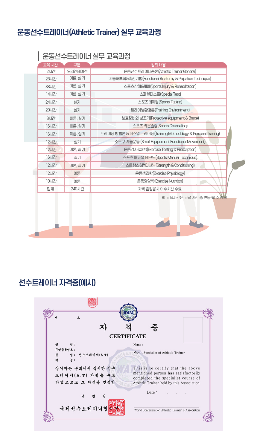 ¿îµ¿¼±¼öÆ®·¹À̳ÊÃÑ·Ð(Athletic Trainer General), ±â´ÉÇØºÎÇÐ(Functional Anatomy), ÃËÁø±â¹ý(Palpation Technique), ½ºÆ÷Ã÷»óÇØ(Sports Injury), ½ºÆ÷Ã÷ÀçȰ(Rehabilitation), ½ºÆä¼ÈÅ×½ºÆ®(Special Test), ½ºÆ÷Ã÷ÀÀ±Þóġ(Sports Emergency), ½ºÆ÷Ã÷ ¹°¸®¿ä¹ý(Physiatrics), ¿îµ¿»ý¸®ÇÐ(Exercise Physiology), ¿îµ¿¿µ¾çÇÐ(Exercise Nutrition), ¾à¹°°ú µµÇÎ(Doping Control), ½ºÆ÷Ã÷½É¸®ÇÐ(½ºÆ÷Ã÷ ¸àÅ» ÄÚĪ), ¿îµ¿°Ë»ç(Exercise Testing), ¿îµ¿Ã³¹æ(Exercise Prescription), ½ºÆ÷Ã÷Å×ÀÌÇÎ(Sports Taping) µîÀÇ ±³À°°úÁ¤À» À̷аú ½Ç½ÀÀ» ÅëÇØ ½ºÆ÷Ã÷ ÇöÀå¿¡¼ ´Ù¾çÇÏ°Ô È°¿ë ÇÒ ¼ö ÀÖµµ·Ï ÇÑ´Ù.